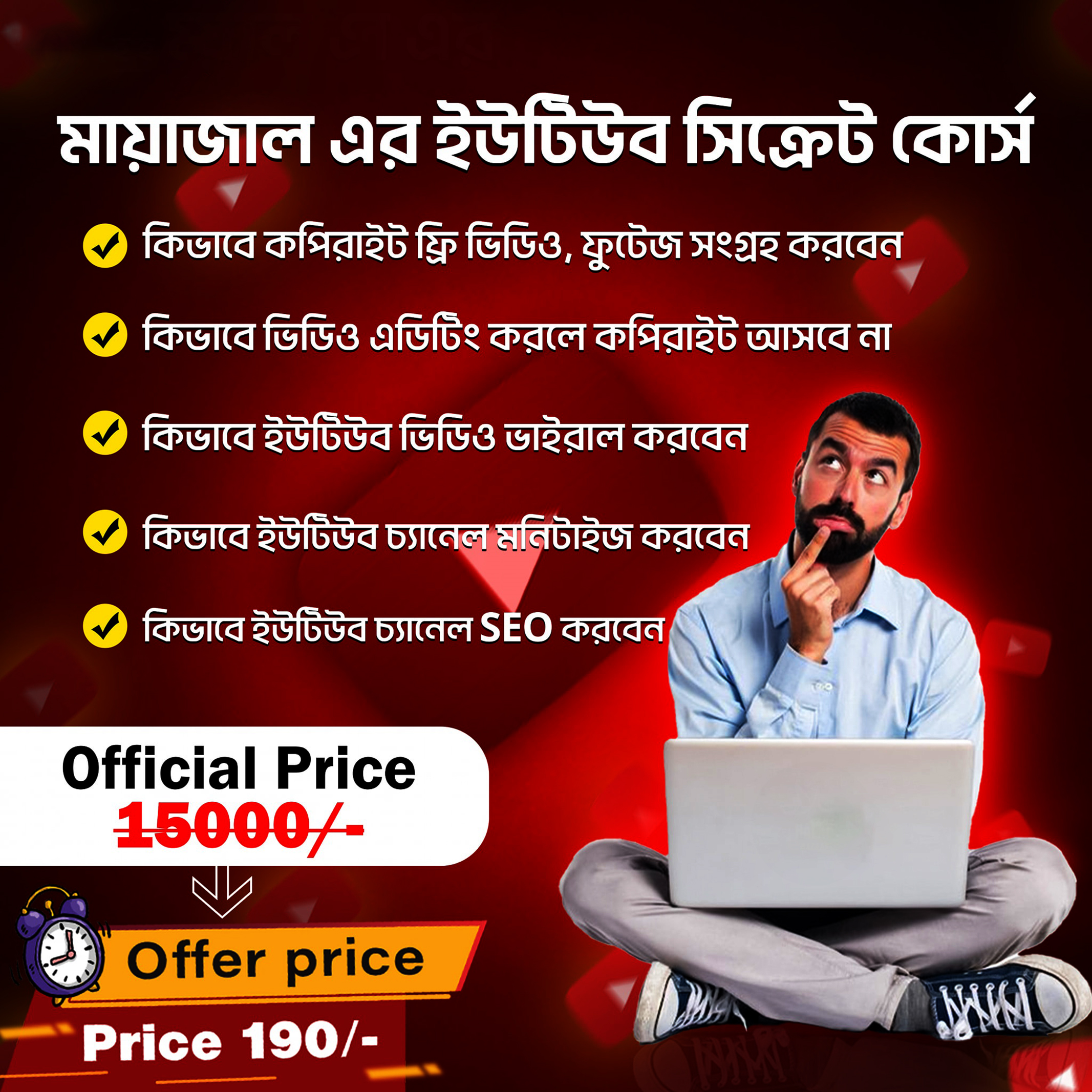 ⭕ মায়াজাল’র এই ইউটিউব ভিডিও মার্কেটিং কোর্সটি শেষ করে ঘরে বসে আপনারা মায়াজালের মতো ভিডিও বানিয়ে আশা করি ইউটিউবে সফল হতে পারবেন । সাধারণত আমরা অনেক সময় সোশ্যাল মিডিয়াতে নষ্ট করি। এই সময় নষ্ট না করে ভিডিও মার্কেটিং এর উপর দক্ষতা অর্জন করুন।